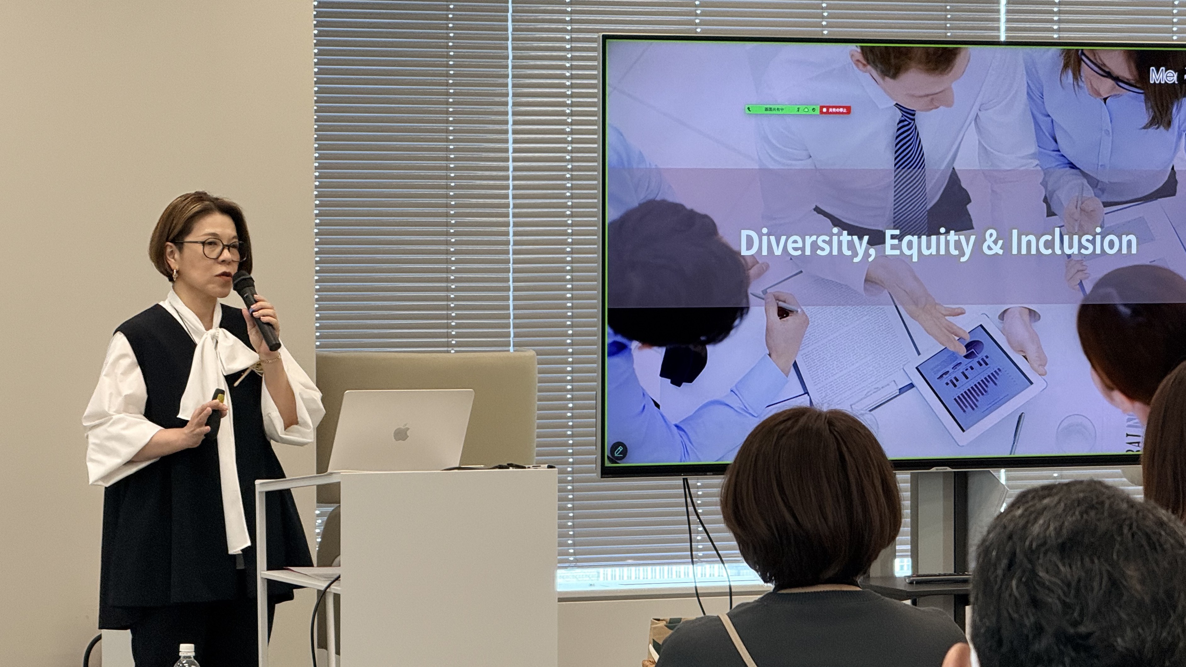 講演では、ダイバーシティは“テーブルに座る権利”、インクルージョンは“そのテーブルで発⾔ができ、かつ、その発⾔が認められること”であり、多様な⼈財が存在するだけでなく、誰もが安⼼して意⾒を表明できる環境があってこそ、多様性は組織の価値として機能することなどが語られました。