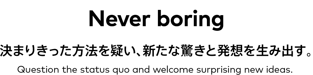 また、異なる視点や価値観を受け⼊れ、新たな発想を⽣み出していくことは、「Never boring」の体現に通じます。