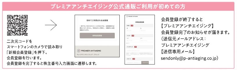 「プレミアアンチエイジング公式通販サイト」でのお買い物でのみご利用いただけるポイントの贈呈のため、インターネットショッピングに必要な会員登録をお願い致します。