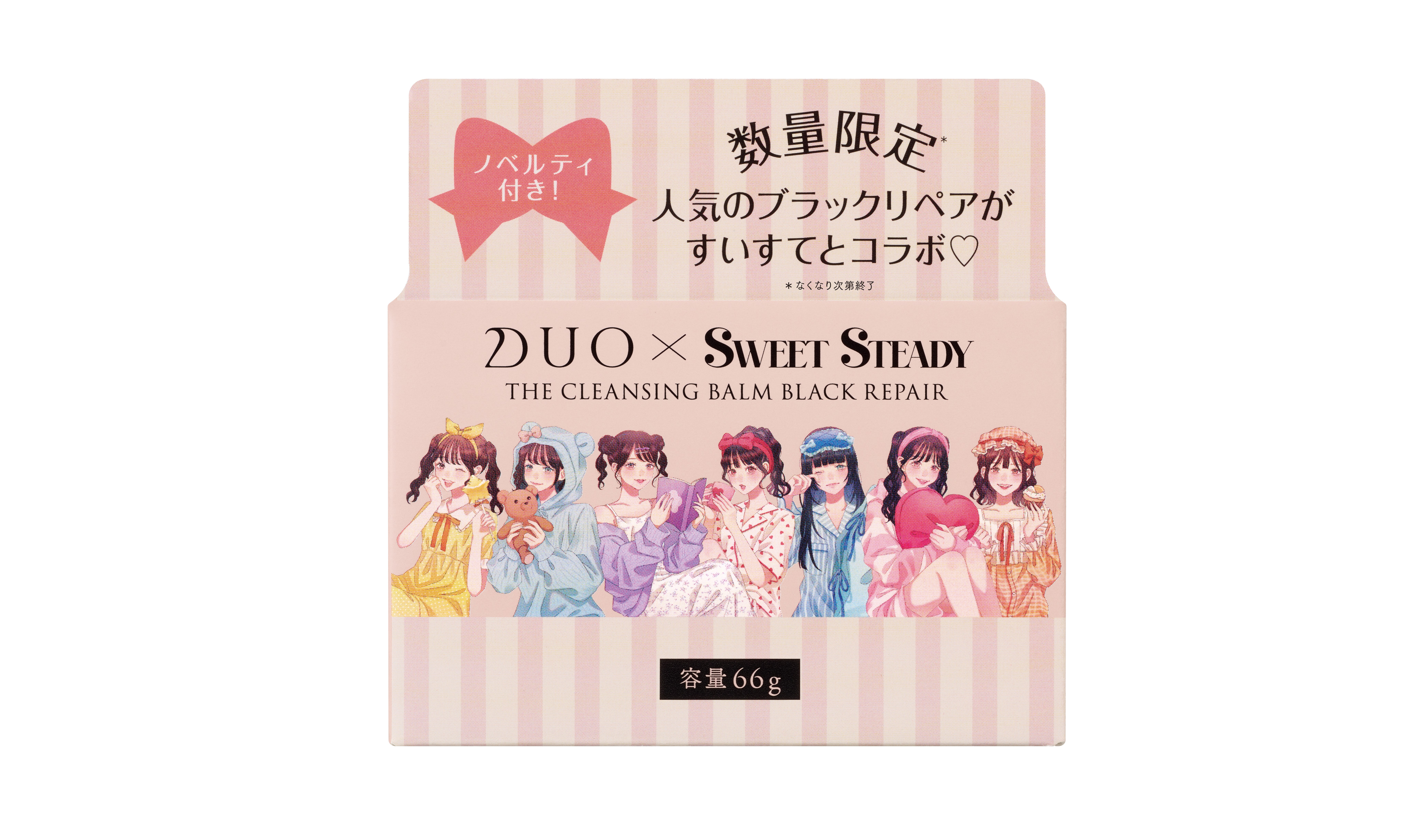 今回の限定商品では、「デュオ ザ クレンジングバーム ブラックリペア」と、若年層から絶大な支持を得ているKAWAII LAB.所属の7人組アイドルグループ「SWEET STEADY」がコラボレーション。さらに、ASOBISYSTEMに所属するイラストレーター「asuka」氏による書き下ろしイラストを配した外箱デザインになります。限定商品のみの付属品として、オリジナルデザインのシュシュ、シール、「SWEET STEADY」トレーディングカード(8種からランダムで1枚入ります。)の豪華セットとなっております。手にとるたびに心がときめくコスメとして、日常に寄り添う新しいブランド体験を提供します。