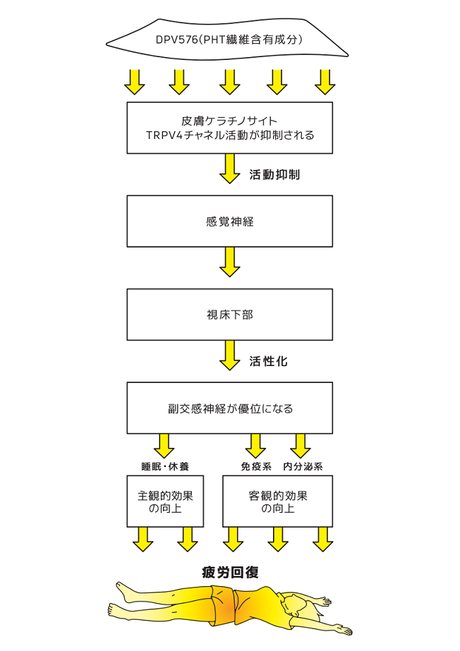 DPV576(PHT繊維内含有成分)が、皮膚の感受センサーに作用し交感神経を抑制(副交感神経を優位)。副交感神経が優位になると、筋肉が弛緩し血管が拡張され、血流を促進。その結果、血流によって新鮮な酸素や栄養素は各細胞に運ばれ、疲労物質に代表される老廃物の除去を促します。また、副交感神経が優位になることで睡眠の質向上も期待でき、その結果、人体本来の活動能力(活力)の回復が促進されます。