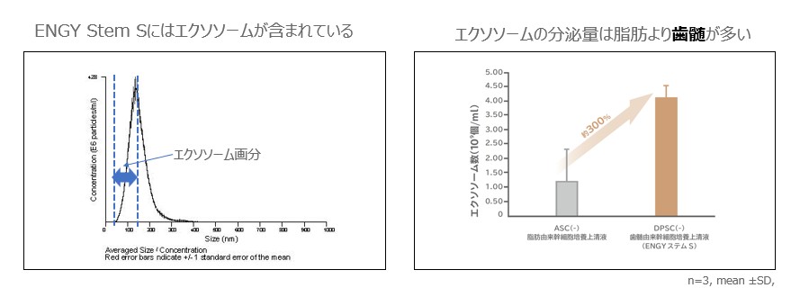 ※3 エクソソーム:細胞同士が連絡(コミュニケーション)する際に放出される、脂質で包まれたカプセル。中にmRNAやタンパク質を含んでおり、細胞間の情報伝達機能を持つ。近年幹細胞培養上清液の再生機能を司る要因として知られてきました。