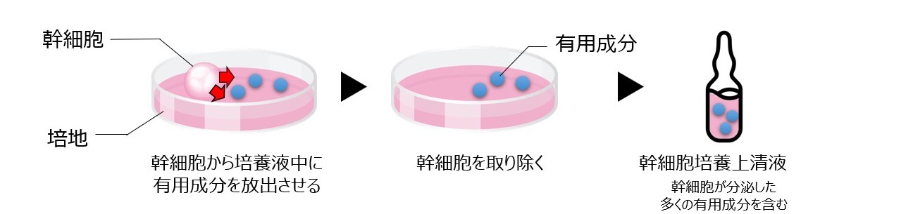 細胞を培養したときの培地(育てるための液)から、有⽤成分を含む上澄み液のみ取り出したものが「幹細胞培養上清液」です。幹細胞は培養時に有⽤な成分を培地に放出します。多くの有⽤成分を含む「幹細胞培養上清液」は周辺の細胞に働きかけ再⽣させる⼒を持つため、再⽣医療領域だけでなく、美容医療や化粧品でも注目されています。