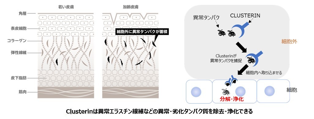 Clusterin(クラステリン)は異常エラスチン線維などの異常・劣化タンパク質を除去・浄化し、皮膚の再生を促します。