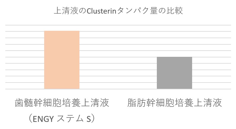 「ENGY ステム S」にどの程度Clusterin(クラステリン)が含まれているか評価するため脂肪幹細胞培養上清液と比較を行いました。その結果、「ENGY ステム S」には約1.8倍Clusterin(クラステリン)が多く含まれており、細胞外の劣化物質を除去し、皮膚再生を促すことが出来ると考えられます。