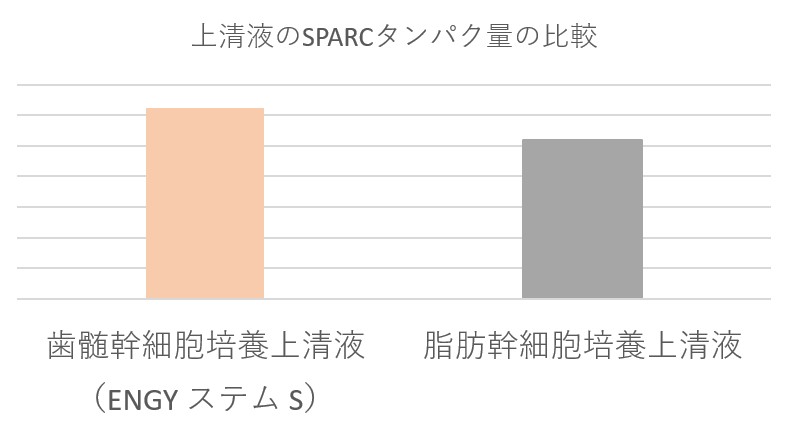 「ENGY ステム S」にどの程度含まれるか確認した結果、脂肪幹細胞培養上清液と比較して、約1.2倍程度オステオネクチン(SPARC)が多く含まれていることが分かりました。オステオネクチン(SPARC)を多く含むことで、皮膚再生の最終ステップ、肌を作る、という部分を担っていると考えられます。